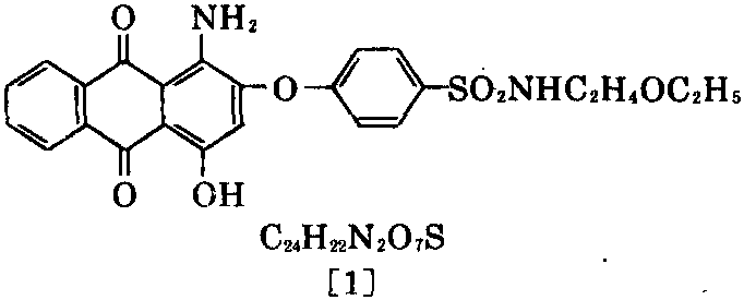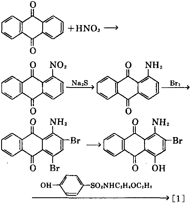 制法: 以蒽醌为原料,在混酸中进行硝化, 再用硫化钠还原,生成1-氨基蒽醌,与溴反应, 生成1-氨基-2,4-二溴蒽醌,再在稀硫酸及 硼酸的溶液中水解,生成1-氨基-2-溴-4- 羟基蒽醌,最后在碱性溶液中与4-羟基乙氧乙 基苯磺酰胺缩合,可制得[1]。