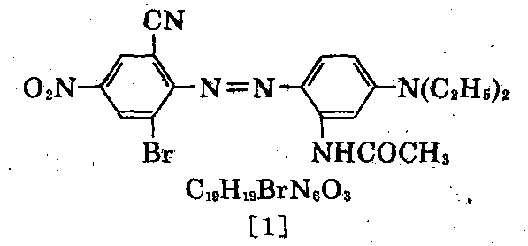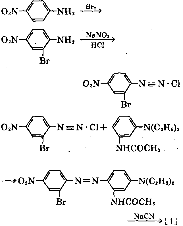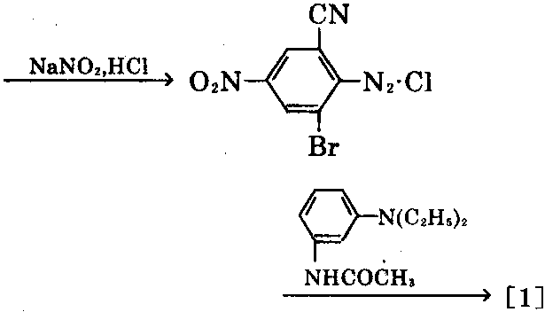 制法:①以对硝基苯胺为原料,经溴卤化 后,在盐酸溶液中与亚硝酸钠进行重氮化反应, 再与间乙酰胺基-N,N-二乙基苯胺偶合,最 后与氰化钠反应,可析出[1]的结晶,过滤,干 燥,粉碎,可获[1]的成品。