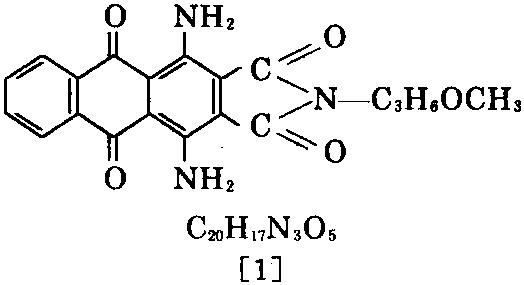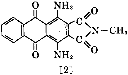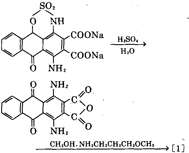 ②按照①法制得1,4-二氨基-3,4-二 氰基蒽醌后,于150℃下,在浓硫酸作用下闭环, 再与甲氧基丙胺在170℃下缩合,可制得[1]。与 甲胺缩合,可制得[2]。