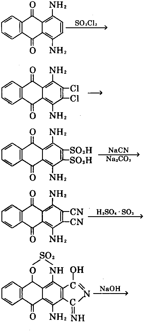 制法:①以1,4-二氨基蒽醌为原料,以磺 酰氯为氯化剂,在30~40℃下进行反应,生成2, 3-二氯-1,4-二氨基蒽醌,再在硼酸及亚硫 酸钠存在下,与浓硫酸反应,进行磺化,中和后, 与氰化钠在90℃下反应,生成1,4-二氨基-2, 3-二氰基蒽醌,然后在发烟硫酸作用下,闭环, 在碱性水溶液中于90~100℃下水解,用硫酸酸 化,再加入甲醇及甲氧基丙胺缩合可制得[1]。