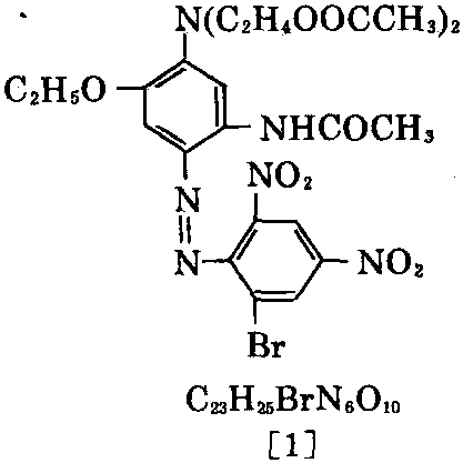制法: 以2,4-二硝基苯胺为原料,溴化, 生成6-溴-2,4-二硝基苯胺,在盐酸中与亚 硝酸钠反应,生成重氮盐[2];以2,4-二硝基苯 甲醚为原料,用硫化钠(或铁粉)还原,生成2-氨 基-4-硝基苯甲醚,为使4位硝基还原,先使2位 氨基羟乙基化,与环氧乙烷反应,生成N,N- 二羟乙基-3-硝基-6-甲氧基苯胺,进一步 用铁粉还原,生成3-(N,N-二羟乙基氨基)- 4-甲氧基苯胺,与乙酸进行酯化反应,3位生成 乙酰氧基,进一步与乙酐(或乙酸)反应,1位氨 基也被乙酰基化,最后生成2-(N,N-二乙 酰氧乙基氨基)-4-(N-乙酰氨基)苯甲醚 [3]。[2]与[3]在碱性溶液中偶合,可制得[1]。