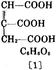 又称1-丙烯- 1,2,3-三羧酸、蓍草酸、 Equisetic acid。天然存 在于甜菜根、甜萝卜及乌头、 天竺葵类中。从水中析出者 为无色至浅黄色的叶片状结 晶。有微弱的香气。相对分子 质量174.11。沸点198~ 199℃。溶于水(15℃时18.2)、乙醇、乙醚。本品有 正反异构体。合成品均为反式。