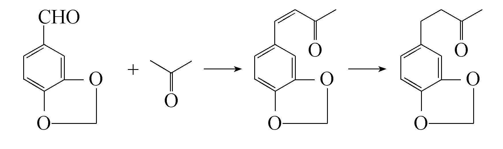 胡椒基丙酮的工业生产方法是,以洋茉莉醛为原料,先在碱性溶液里与丙酮缩合,再选择性加氢而成。