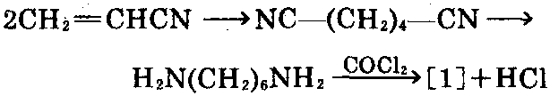 ② 以己二胺为原料,与二氧化碳在氯苯溶 液中反应,生成己二胺碳酸盐,低温下与光气反 应,生成己二胺碳酰氯,再在高温下使己二胺碳 酰氯分解,生成粗制[1],降温后,过滤,减压,蒸 出氯苯回收,再减压精馏精制,可获得[1]。