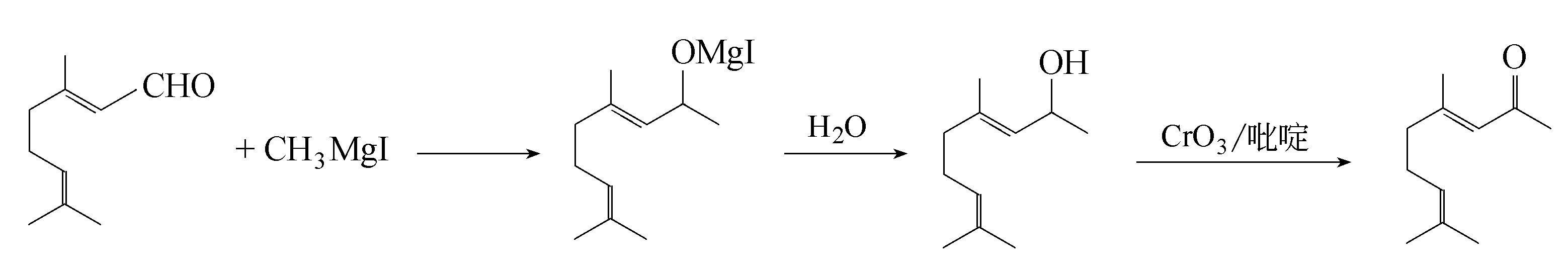 一篇西班牙文研究报告声称,柠檬醛与甲基碘化镁的格氏反应是在乙醚中进行的,将制得的络合物用水水解后可得到收率为89.2%的顺式和反式α-甲基香叶醇。将α-甲基香叶醇在己烷中用活性二氧化锰氧化,可得到重量收率为70%的顺式和反式柑橘酮,顺反异构体之间的比例为35∶65,反式体居多数(Chem,Abs.V72,121720)。