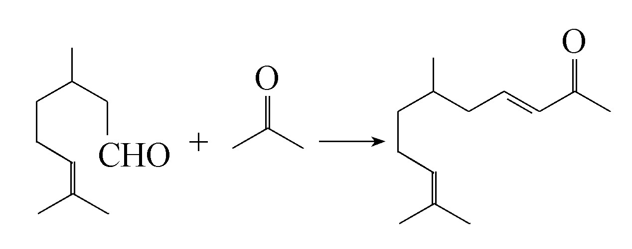 亚香茅基丙酮可以天然香茅油为原料,在碱性条件下与丙酮相互作用制得。在实际反应过程中,主要是由香茅油中所含的香茅醛与丙酮进行缩合反应。
