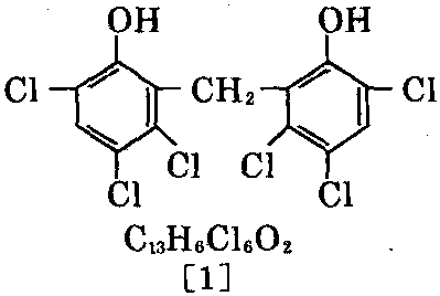 又称 2,2′-亚甲基 双(3,4,6-三氯 苯酚)、2,2′- 二羟基-3, 3′,5,5′,6,6′- 六氯二苯甲 烷、六氯酚、双 (3,5,6-三氯-2-羟基苯基)甲烷、Bilevon、 Exofene、Gramophen、Dermadex、Hexosan。 从苯中析出者为白色至浅黄色针状结晶,或结 晶性粉末。有苯酚气味。相对分子质量406.91。 熔点164~165℃。不溶于水,可溶于乙醇、乙醚、 丙酮、氯仿、丙二醇、聚乙二醇、橄榄油、棉籽油 和稀碱液。与碱金属及碱土金属形成盐。从细菌 学的观点来看,本品与吐温类化合物不相容。大 鼠经口60mg/kg。妇女妊娠期长期处于六氯双 酚环境中,有可能使婴儿畸形。