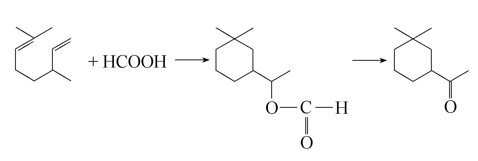 阿弗曼酮是由二氢月桂烯和甲酸为原料,经二步反应制成的[美国专利3847975;Journ.org.chem.1972,37(6),920]。