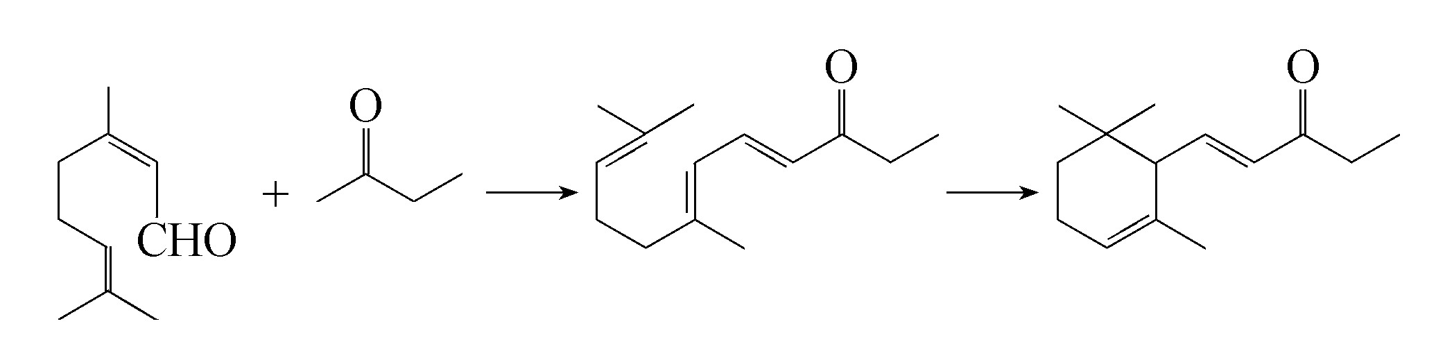 甲基紫罗兰酮是由柠檬醛和丁酮在碱性条件下缩合成假性甲基紫罗兰酮,然后再环化制成的。