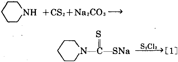 制法: 以六氢吡啶、碳酸钠和二硫化碳为 原料,加热反应,先生成五亚甲基二硫代氨基甲 酸钠,后者再进一步与一氯化硫反应,进行硫 化,可制得[1]。