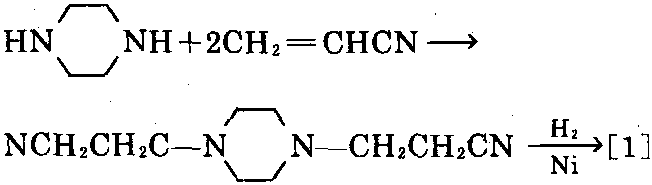 制法: 以哌嗪为原料,与丙烯腈反应,生成 双丙烯腈基哌嗪,进一步在镍催化剂作用下,进 行还原,可制得[1]。