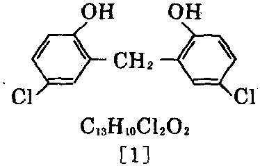 又称5,5′-二 氯-2,2′-二羟 基二苯基甲烷,双 (5-氯-2-羟基 苯)甲烷、防腐剂 Ansco Preventol GD、Amthiphen、Dicestal、 Didroxane、Diphenthane-70、Hyosan、 Parabis、Plath-Lyse、Teniathane、Wespuril。 从甲苯中析出者为无色或白色结晶。相对分子 质量269.12。相对密度0.60~0.65。熔点177~ 178℃。25℃时蒸气压1.333×10-7Pa。不溶于 水,微溶于甲苯,溶于乙醇(25℃时)、乙醚(25℃ 时1g/g),也溶于甲醇、异丙醚和石油醚,溶于碱 溶液。毒性低。小鼠经口LD501000mg/kg。