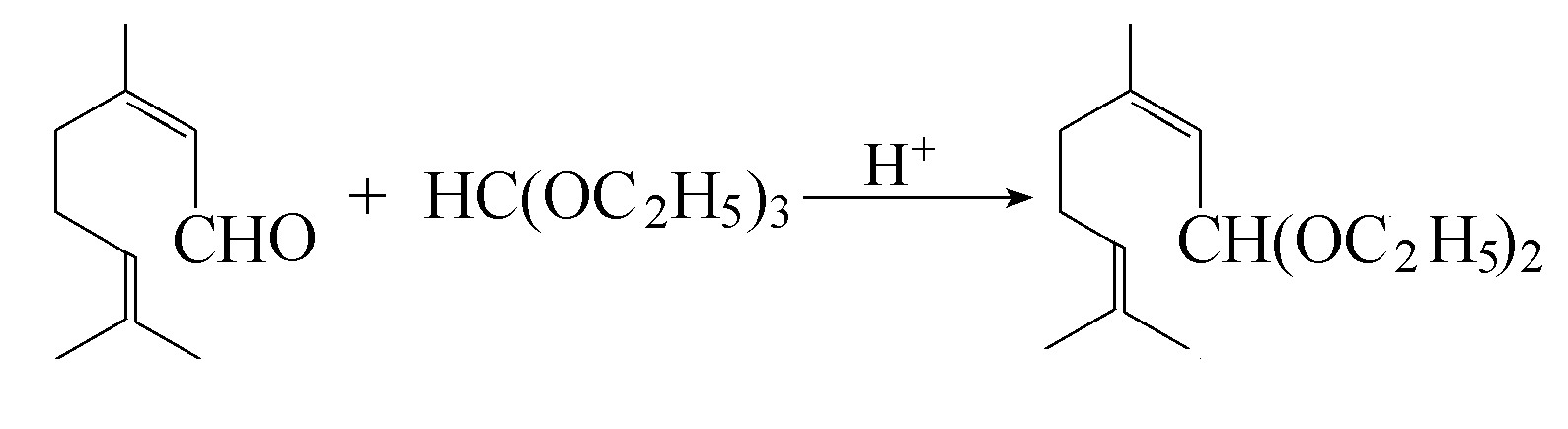 柠檬醛二乙缩醛系由柠檬醛与原甲酸三乙酯为原料,在对甲苯磺酸为催化剂和无水乙醇的存在下相互作用制得。