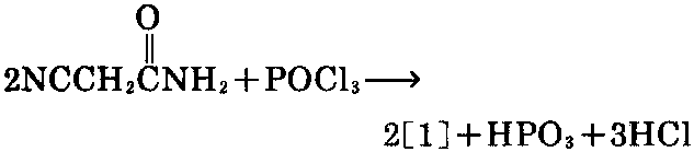 制法:①以氰基乙酸乙酯为原料,氨解,生 成氰基乙酰胺,将生成物在二氯乙烷中,在三氯 氧磷的作用下,进行消除反应,可制得[1]。