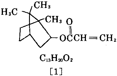 又称丙烯酸异龙脑酯、丙烯酸2-莰烷基酯。 无色油状液体。有松针样的令人愉快的香气。相 对分子质量208.30。相对密度0.994。熔 点-60℃,沸点119~121℃(2.000×103Pa)、 104℃(0.667×103Pa)。闪点97℃。折射率1.4744 (25℃)。粘度7.7mPa·s。能聚合,聚合物玻 璃化温度94℃。贮存时应加入阻聚剂氢醌甲基 醚。几乎不溶于水,溶于乙醇和丙酮。