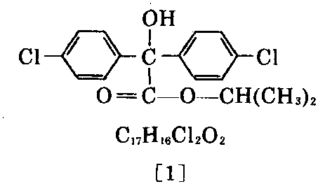 又称4, 4′-二氯二苯基乙醇酸异丙酯、Acaralate、 Chlomite、Chloromite、G24163、Rospin。白色 结晶。相对分子质量323.22。熔点73~75℃。沸 点148~150℃(0.0667×103Pa)。20℃时的蒸 气压0.107Pa。微溶于水(室温小于10×10-6),溶 于丙酮、二甲苯和石油。大鼠经口LD505000 mg/kg。