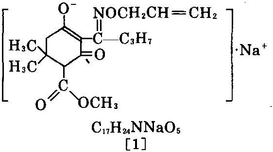 又称枯杀达、2,2- 二甲基-4,6-二氧-5-{1-[(2-烯丙氧基) 氨基]亚丁基}-3-环己烯-1-羧酸甲酯钠 盐。无色、无嗅晶体。相对分子质量345.20。熔点 185.5℃(分解)。30℃时的溶解度(g/kg)为: 水>2000、丙酮14、环己酮2、乙酸乙酯2、二甲苯 0.02、甲醇619、乙醇50、丁酮0.15、二甲基甲酰胺 1000。蒸气压<1.333×10-3Pa。热稳定性好。有 吸湿性。无毒、对皮肤、粘膜无刺激性。1973年制 出,1980年正式登记为农药。大鼠经口LD502320 mg/kg,经皮LD501630mg/kg。