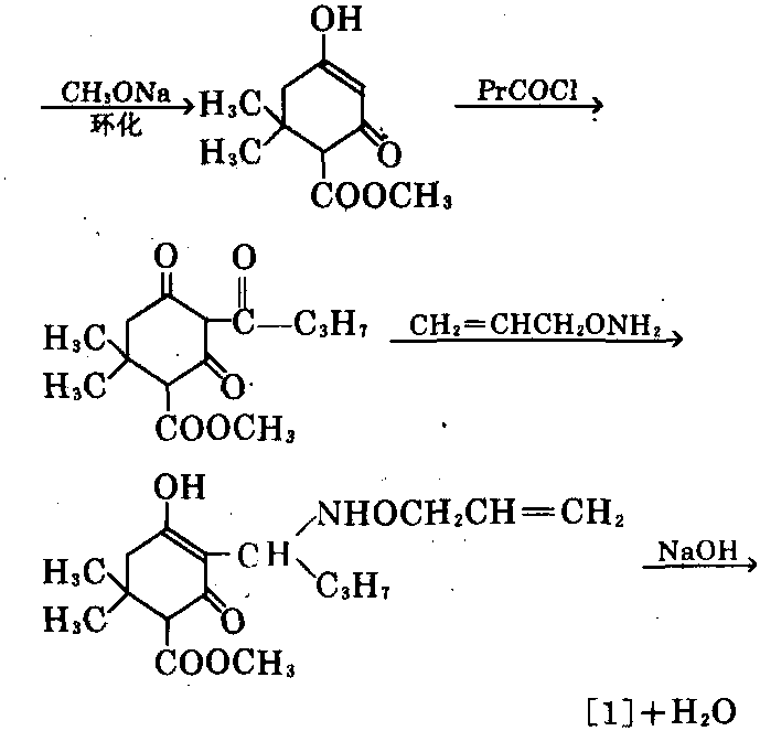 制法: 在甲醇的碱溶液中,由丙二酸二甲 酯同仲丁烯基甲基酮进行反应,环化,生成6, 6-二甲基-2,4-二氧-环己烯-3-甲酸甲 酯,再进行酰氯化,为了在3位上接上丁基,可用 丁酰氯进行催化酰化,然后在催化剂的作用下, 进行分子重排,生成6,6-二甲基-2,4-二 氧-3-丁酰基-环己烯甲酸甲酯,继续进行相 转移催化反应,然后与烯丙氧基胺反应,可制得 4-羟基-6,6-二甲基-2-氧-3- {1-[(2-烯丙氧基)氨基]]亚丁基}-3-环己烯- 1-羧酸甲酯,最后与碱作用成盐,可制得 [1]。