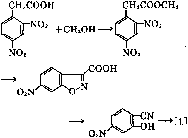 ② 以2,4-二硝基苯乙酸为原料,与甲醇 反应,生成甲酯,在亚硝基丁酸作用下,闭环,生 成苯并异唑,加入盐酸酸化,苯并异唑水 解,生成4-硝基-2-羟基苯腈,将此生成物与 水、硫酸、冰醋酸一起加热煮沸,可水解,生成[1]。
