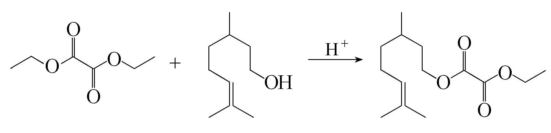 草酸乙基香茅基混合酯可在酸性催化剂存在下,由香茅醇与草酸二乙酯进行酯交换反应制成(北京日化,1987,№1,30)。