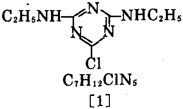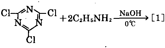 ②溶剂法。以三氯乙烯为溶剂,于30℃以 下,使三聚氯氰与乙胺进行一取代反应。得2, 4-二氯-6-乙胺基-1,3,5-三嗪,然后加液 碱,进行二取代,制成[1]。