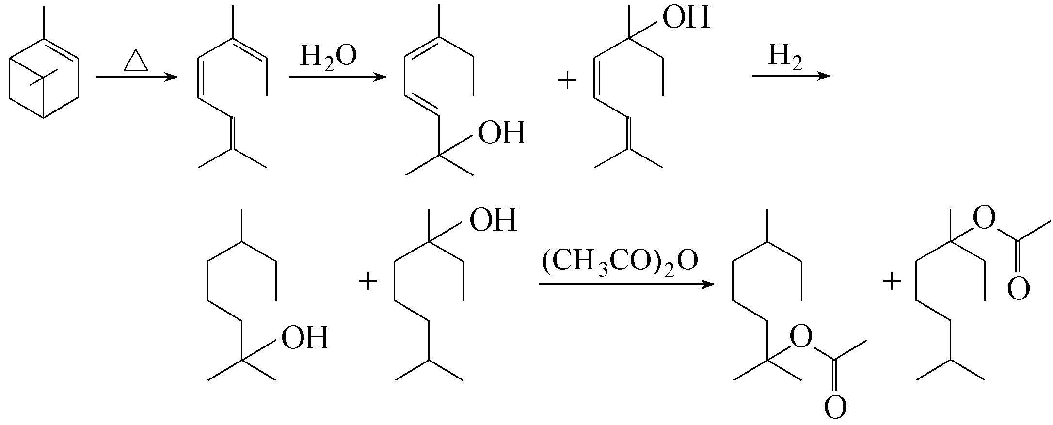 以α-蒎烯为原料,先裂解得到别罗勒烯,再经水化生成别罗勒烯醇混合物,后者彻底氢化后则成为四氢别罗勒烯醇混合物,亦即四氢月桂烯醇和四氢芳樟醇混合物,经乙酰化后则成为乙酸四氢别罗勒烯酯。
