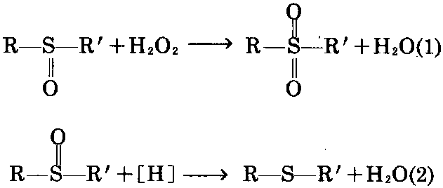 导读:亚砜 : 有两个碳原子与硫原子结合并且有亚硫酰基(S→O )结构的化合物称之为亚砜。如二甲基亚砜[1]、二乙基亚砜[2]、苄苯亚砜[3]等。亚砜中的氧原子呈负离子状态,且不受两个基的,有很强的极性。强氧化性。弱碱性。为无色结晶。溶于乙醇、乙醚和水。也可被氧化成砜。或被还原为硫醚(见反应式(1)及(2))。亚砜有许多重要的反应,