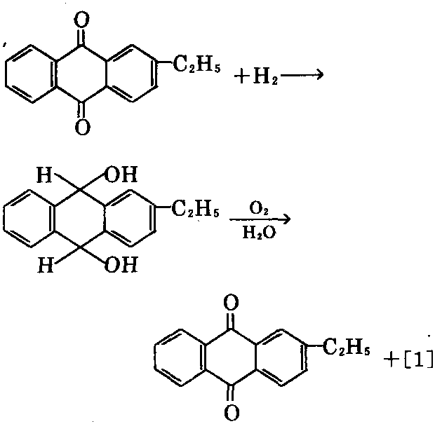 ② 由2-乙基蒽醌在钯催化剂作用下加 氢,制得氢化蒽醌,进一步用空气氧化,可制 得[1]。2-乙基蒽醌可循环使用。